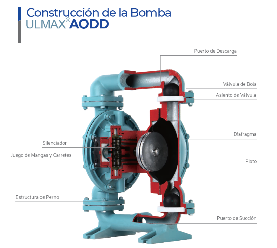 Las bombas Ulmax AODD están disponibles en tamaños desde 1/4” hasta 3”, con caudales que van desde 18 L/min hasta 968 L/min, dependiendo del modelo y material (metálico o no metálico).
