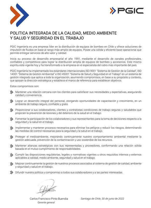 En PGIC Ingeniería, contamos con un Sistema de Gestión Integrado (SGI) certificado bajo las normas ISO 9001:2015 (Calidad), ISO 14001:2015 (Gestión Ambiental) e ISO 45001:2018 (Seguridad y Salud en el Trabajo). Este sistema constituye la base de todos nuestros procesos y refleja nuestro compromiso con la excelencia, la sostenibilidad y el bienestar de las personas. Nuestros compromisos son: - Mantener una relación cercana con los clientes para satisfacer sus necesidades y expectativas, asegurando calidad y conveniencia. - Lograr un desarrollo integral del personal, otorgando oportunidades de capacitación y crecimiento, en un ambiente de trabajo seguro, confiable y grato. - Proporcionar a sus colaboradores, clientes y contratistas condiciones de trabajo seguras y saludables que propicien la prevención de lesiones y del deterioro de la salud en el trabajo. - Fomentar la participación de los colaboradores y sus representantes para la toma de decisiones respecto a la seguridad y la salud en el trabajo. - Implementar y mantener procesos necesarios para eliminar los peligros y reducir los riesgos, determinando las medidas de control necesarias para la seguridad y la salud en el trabajo. - Proteger el medioambiente, mejorando continuamente nuestro comportamiento ambiental mediante la gestión adecuada, prevención de la contaminación y uso sostenible de los recursos. - Mantener alianzas estratégicas con sus representadas y proveedores, conformando una relación sólida basada en el mutuo cumplimiento de responsabilidades. - Cumplir las disposiciones regulatorias, legales y normativas vigentes u otros requisitos internos y externos aplicables a calidad, medio ambiente, seguridad y salud en el trabajo. - Mejorar continuamente la gestión de nuestros procesos asociados al sistema de gestión de calidad, ambiente y seguridad y salud en el trabajo. - Difundir nuestra política y compromiso a todos sus colaboradores y a las partes interesadas.
